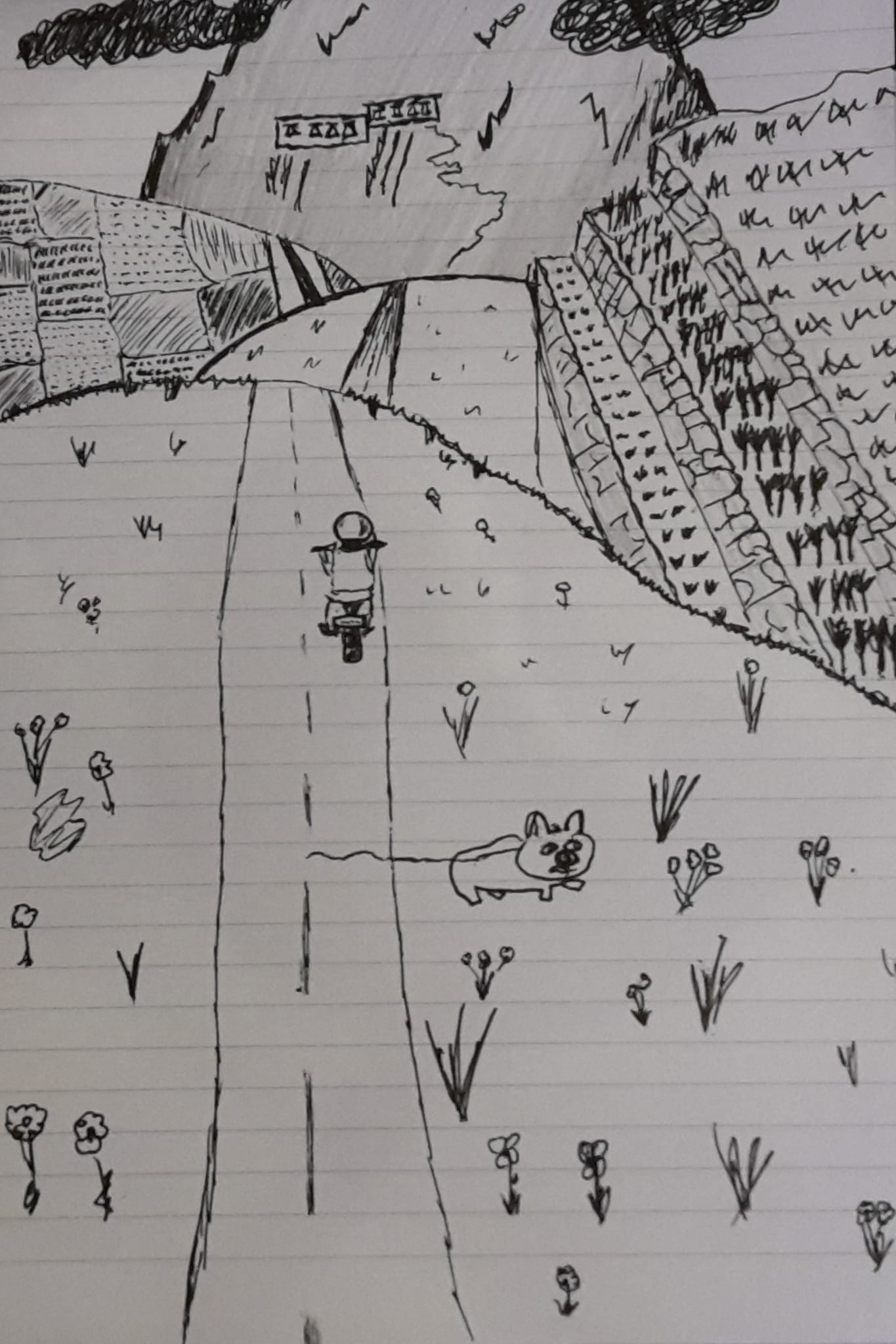 From Renée: I locked up the brakes twice. Once for an old dog that limped onto the road, while a shepherd looked on. Once because a pig crossed the road between Michael and I, I was afraid it’s trailing rope would get tangled in my wheels.